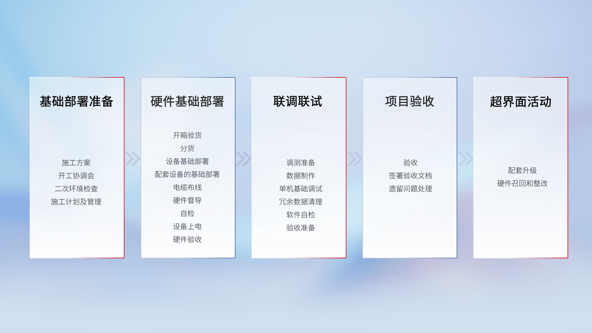 从基础部署准备、、、硬件基础部署、、、联调联试、、、项目验收、、、越界面活动的全过程可追溯,,,,保证施工质量和进度。。
