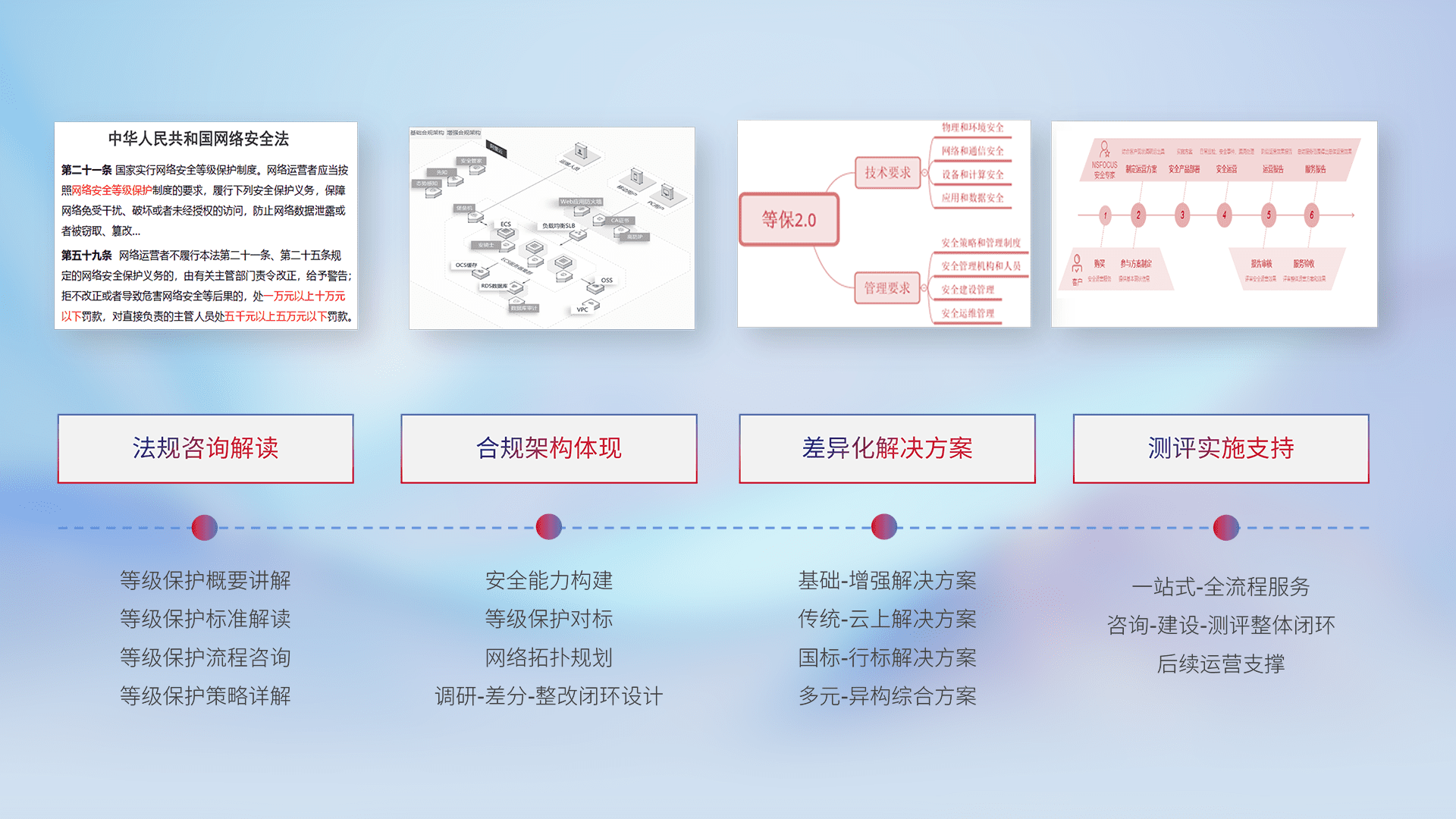 通过专业的法律咨询解读、、、、合规架构体现、、、差异化解决方案、、、、测试实施支持等服务,,为客户量身打造等保合规体系。。