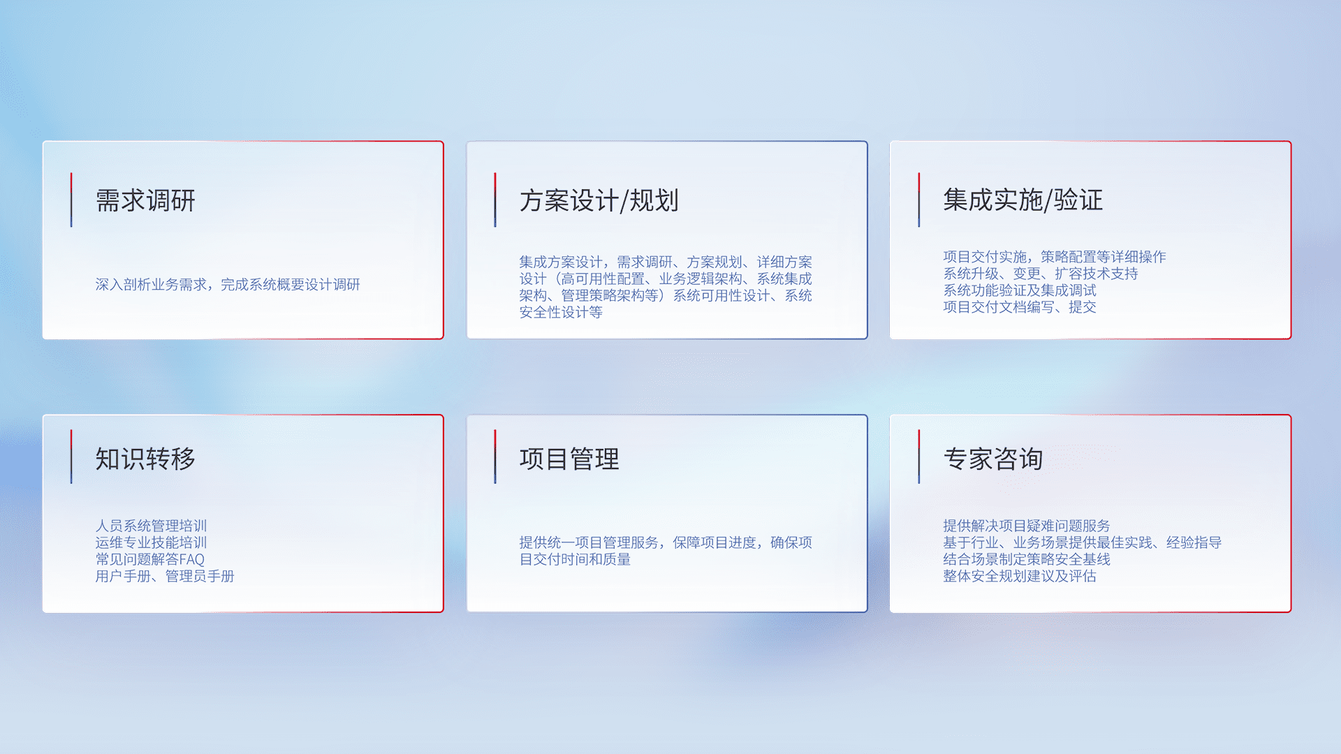 针对客户行业特性,,,,将宏观的安全战略和需求,,,通过专业的交付服务,,,,实现项目落地,,,为客户提供标准规范的集成交付服务。。